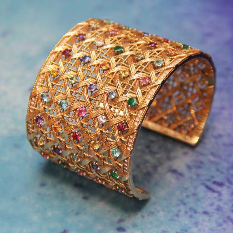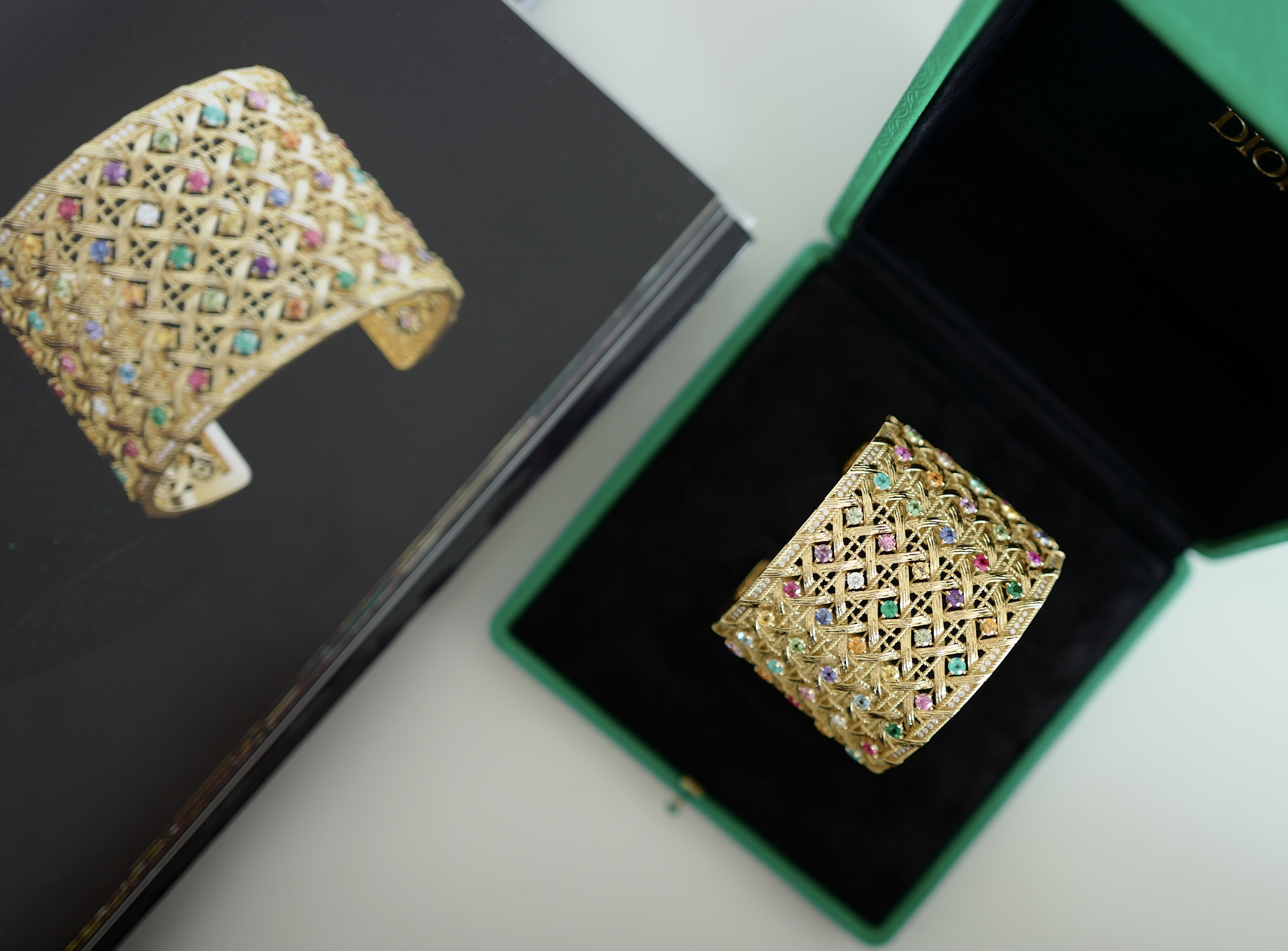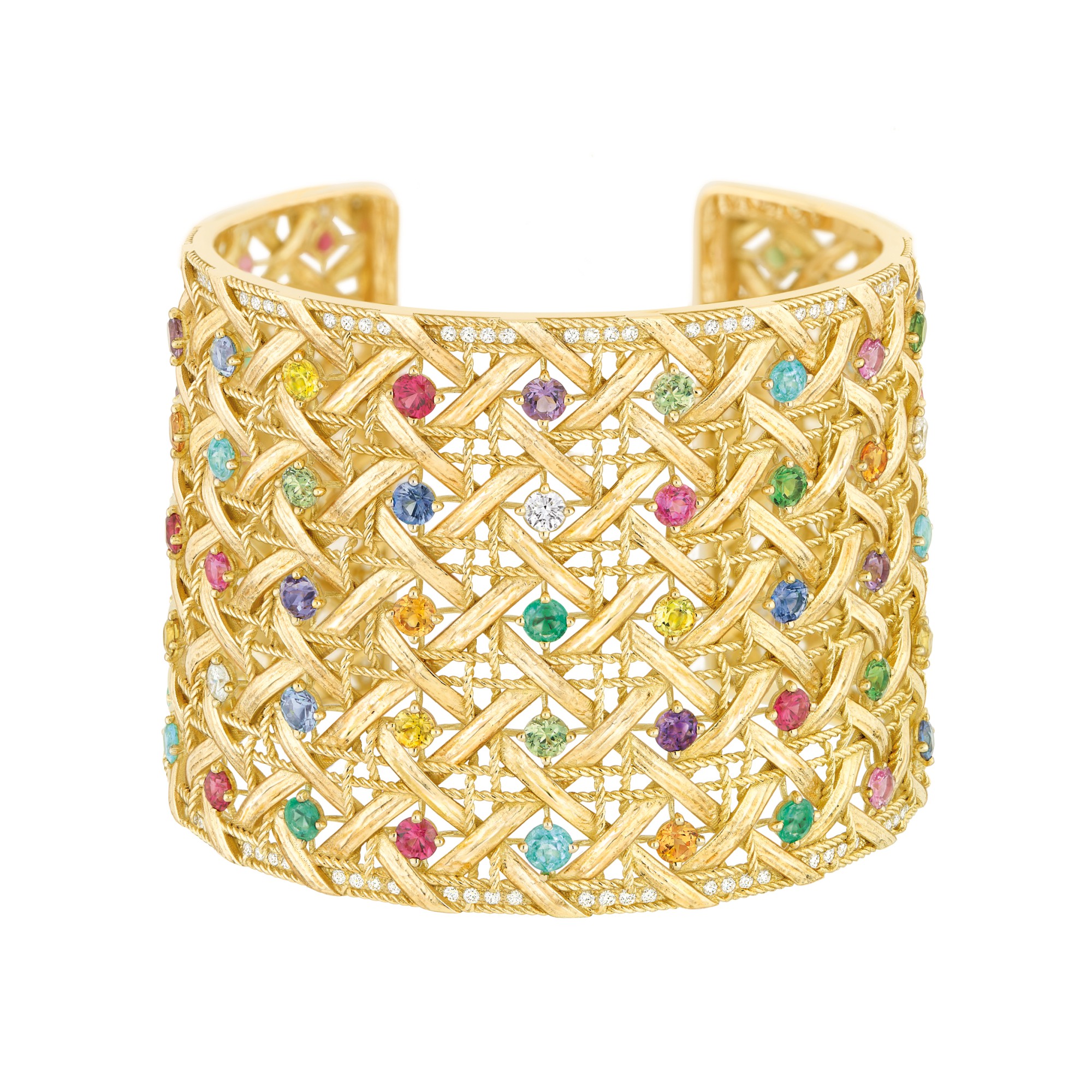 The wide cuff of intricate basket weave construction with rope twist detailing inspired by the original Dior salon's cane work chairs, set with various circular-cut colored stones including tourmalines, spinels, garnets and sapphires, bordered with brilliant-cut diamonds.