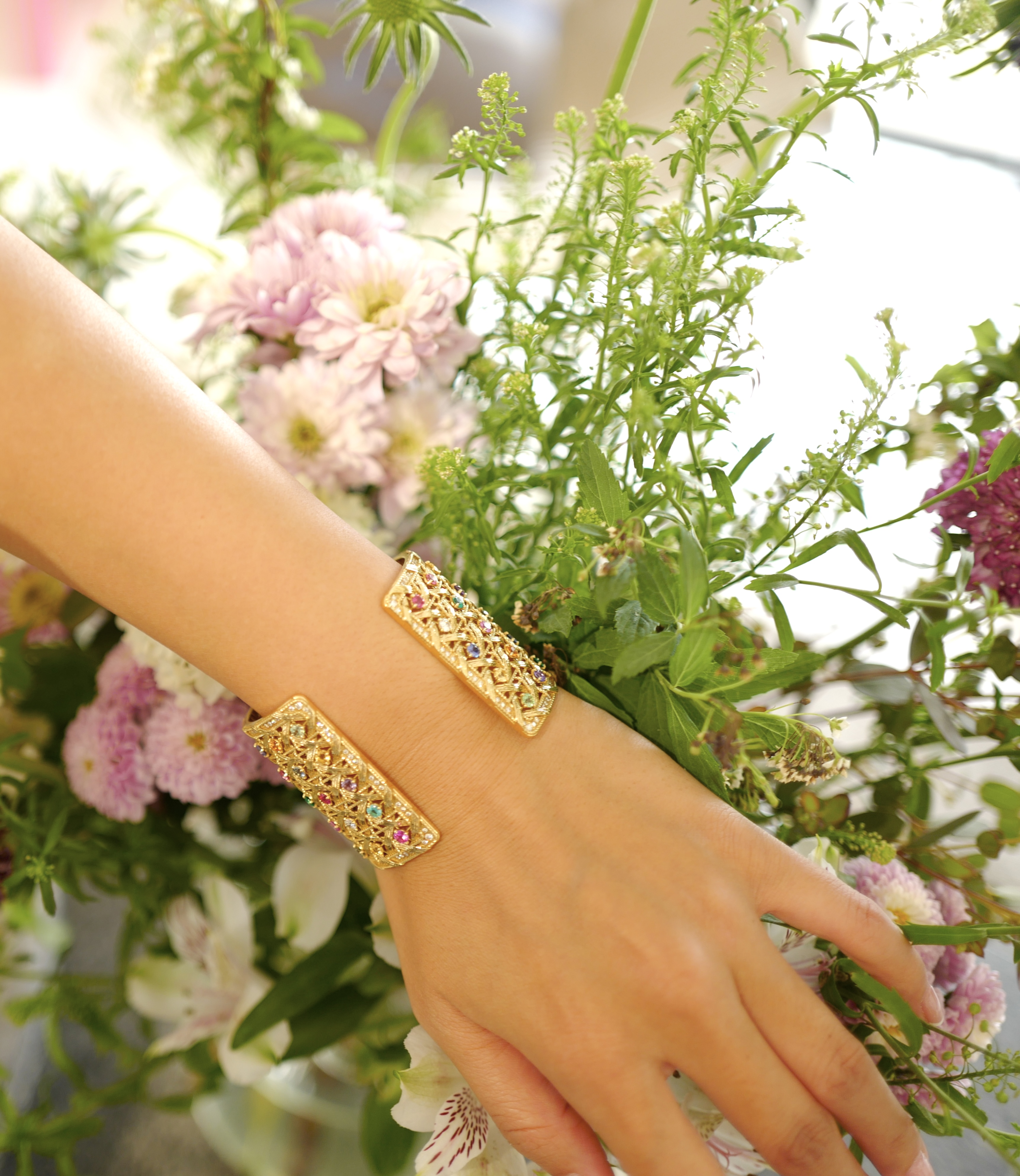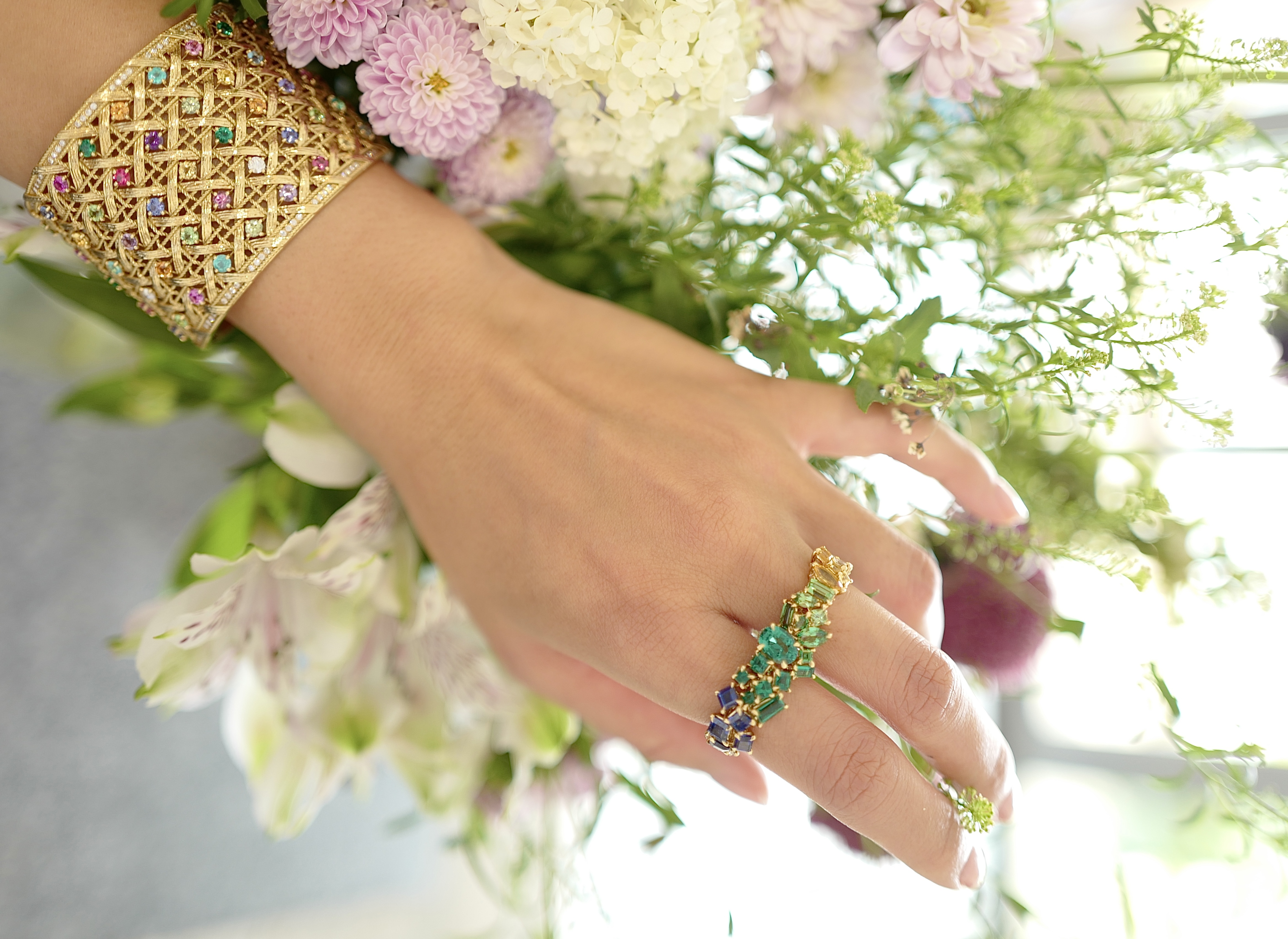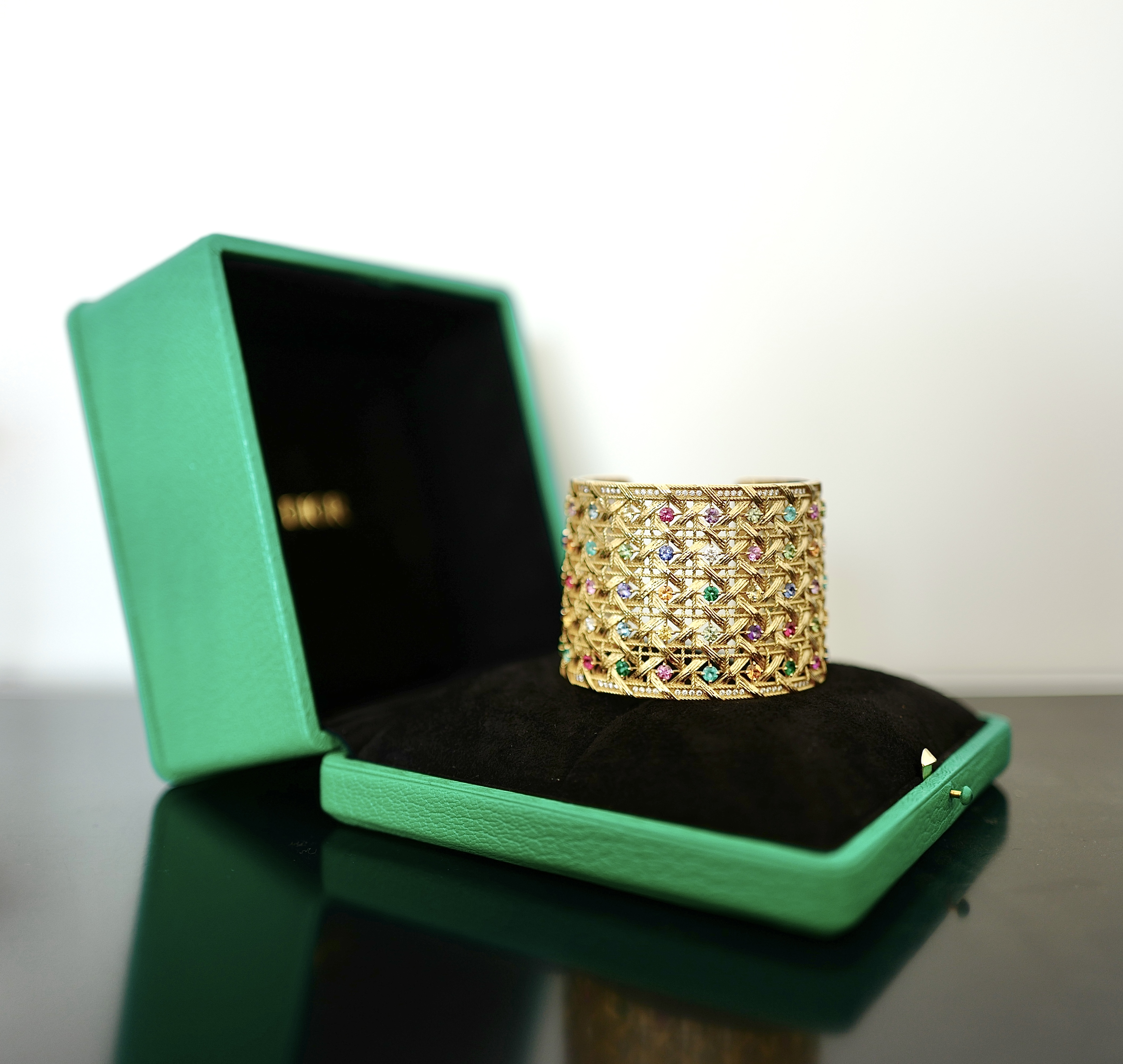 The wide cuff of intricate basket weave construction with rope twist detailing inspired by the original Dior salon's cane work chairs, set with various circular-cut colored stones including tourmalines, spinels, garnets and sapphires, bordered with brilliant-cut diamonds.