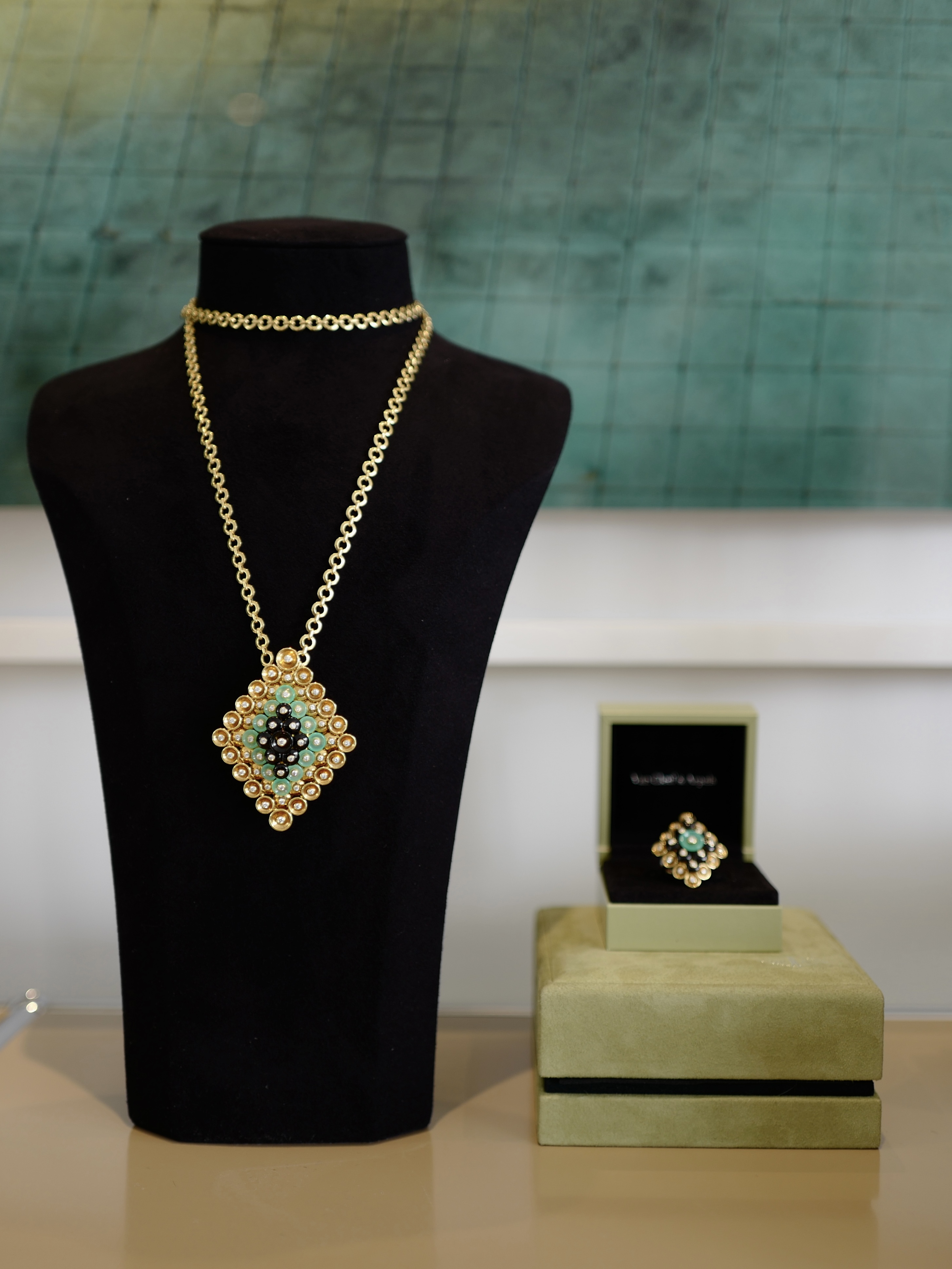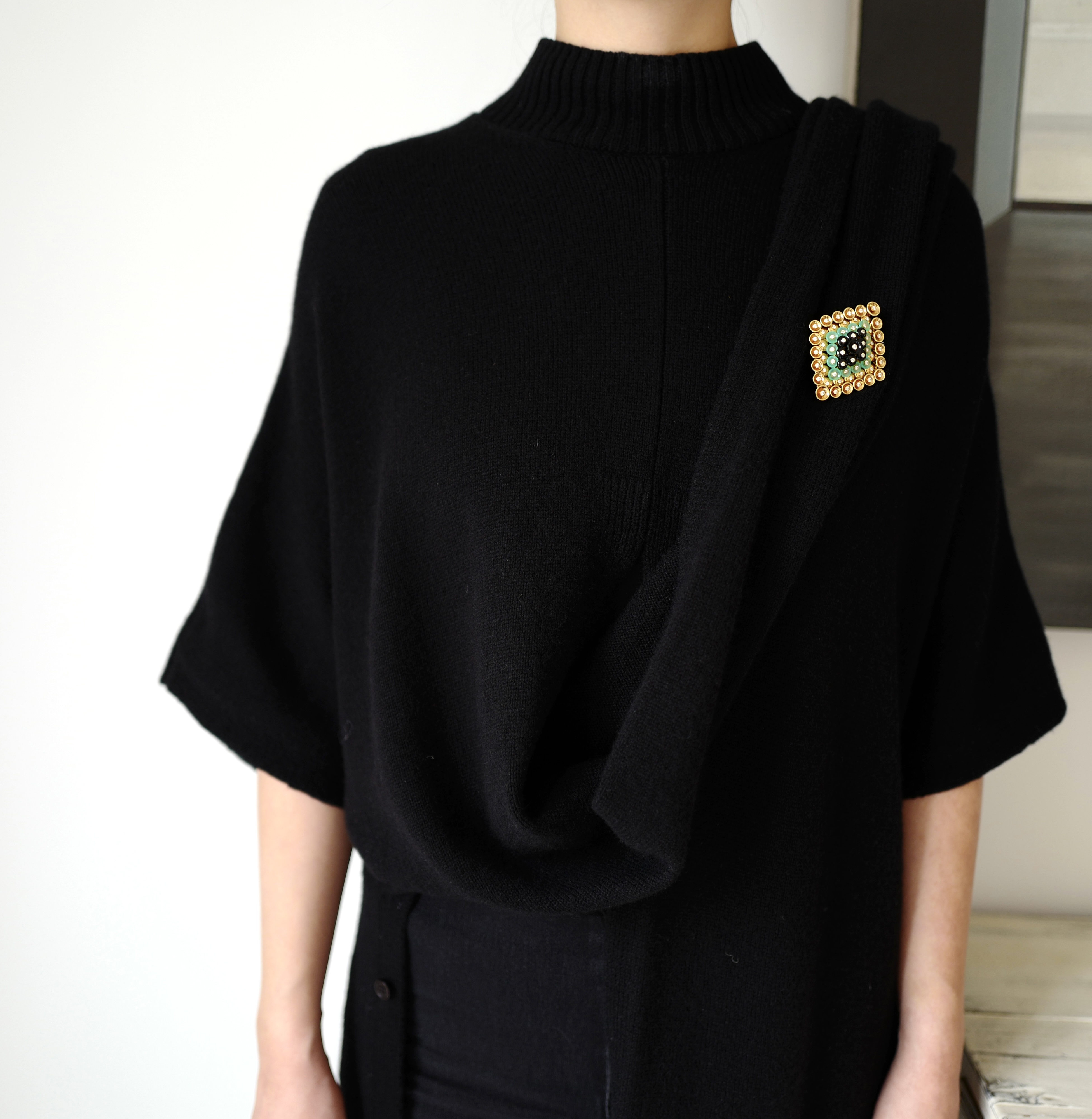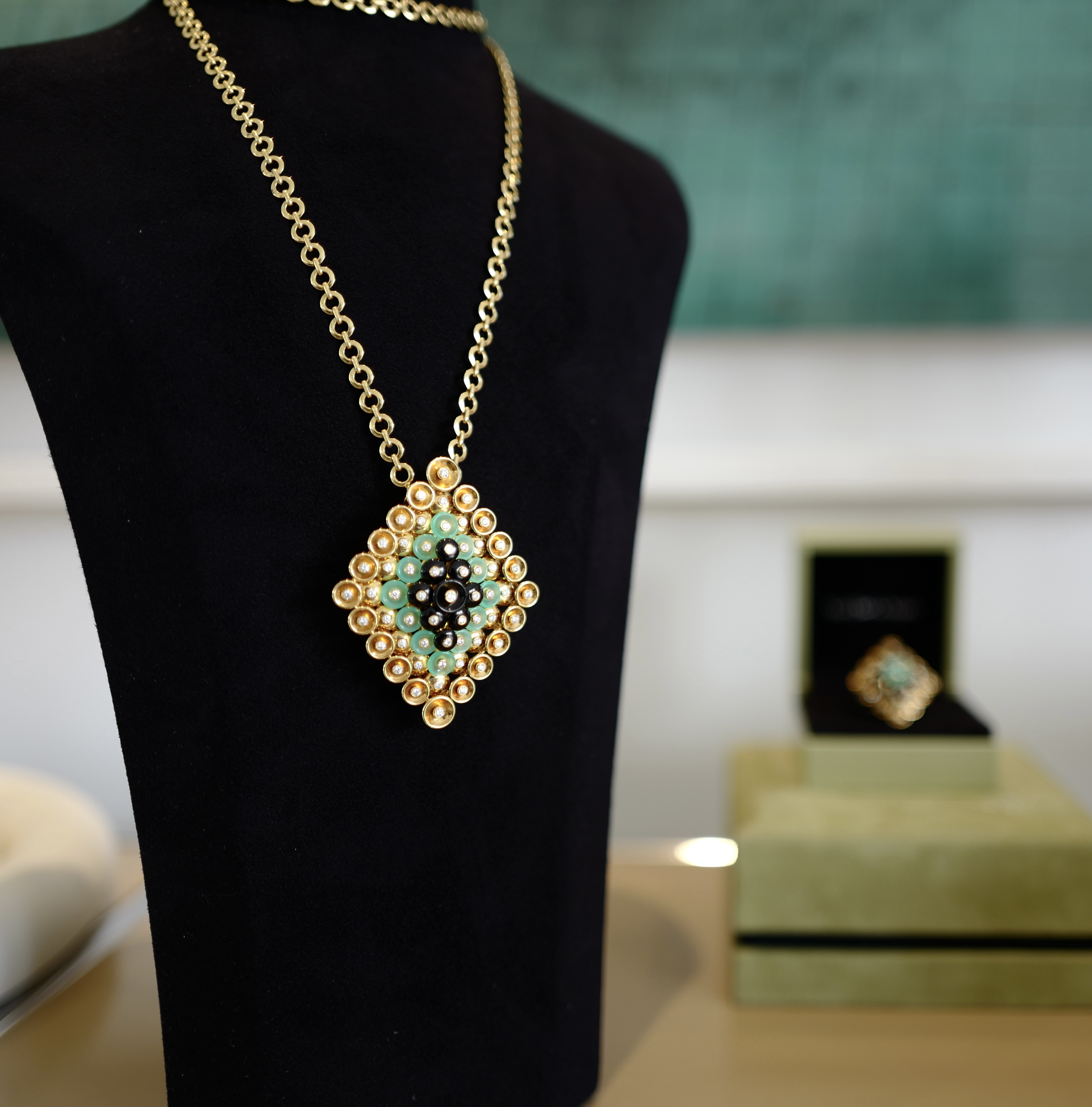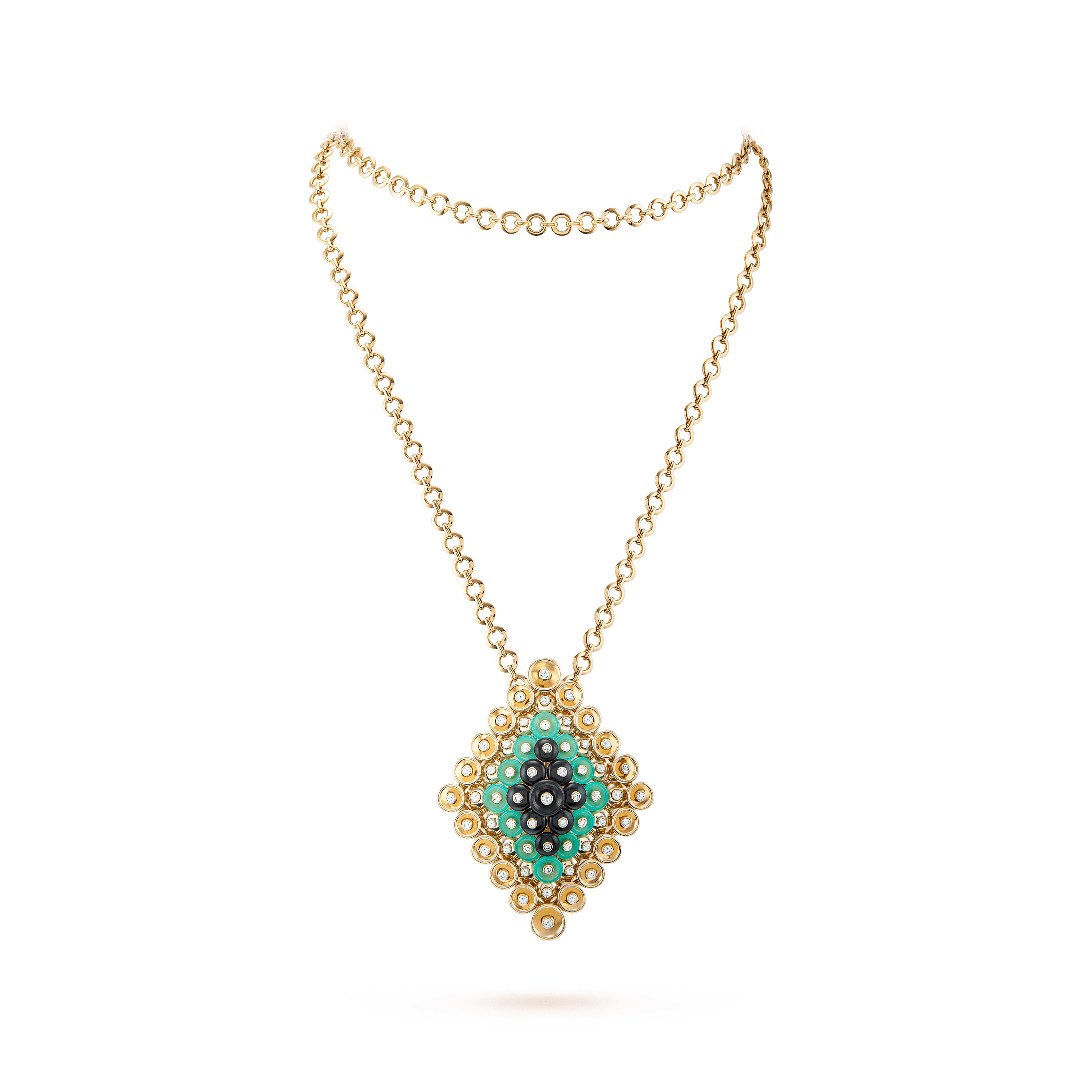 The Bouton d’or collection is inspired by the curved lines of the paillette motif, a jewelry design created in the late 1930s. The detachable clip can be separated from the necklace. The material are composed of yellow gold, chrysoprase, onyx and diamond.