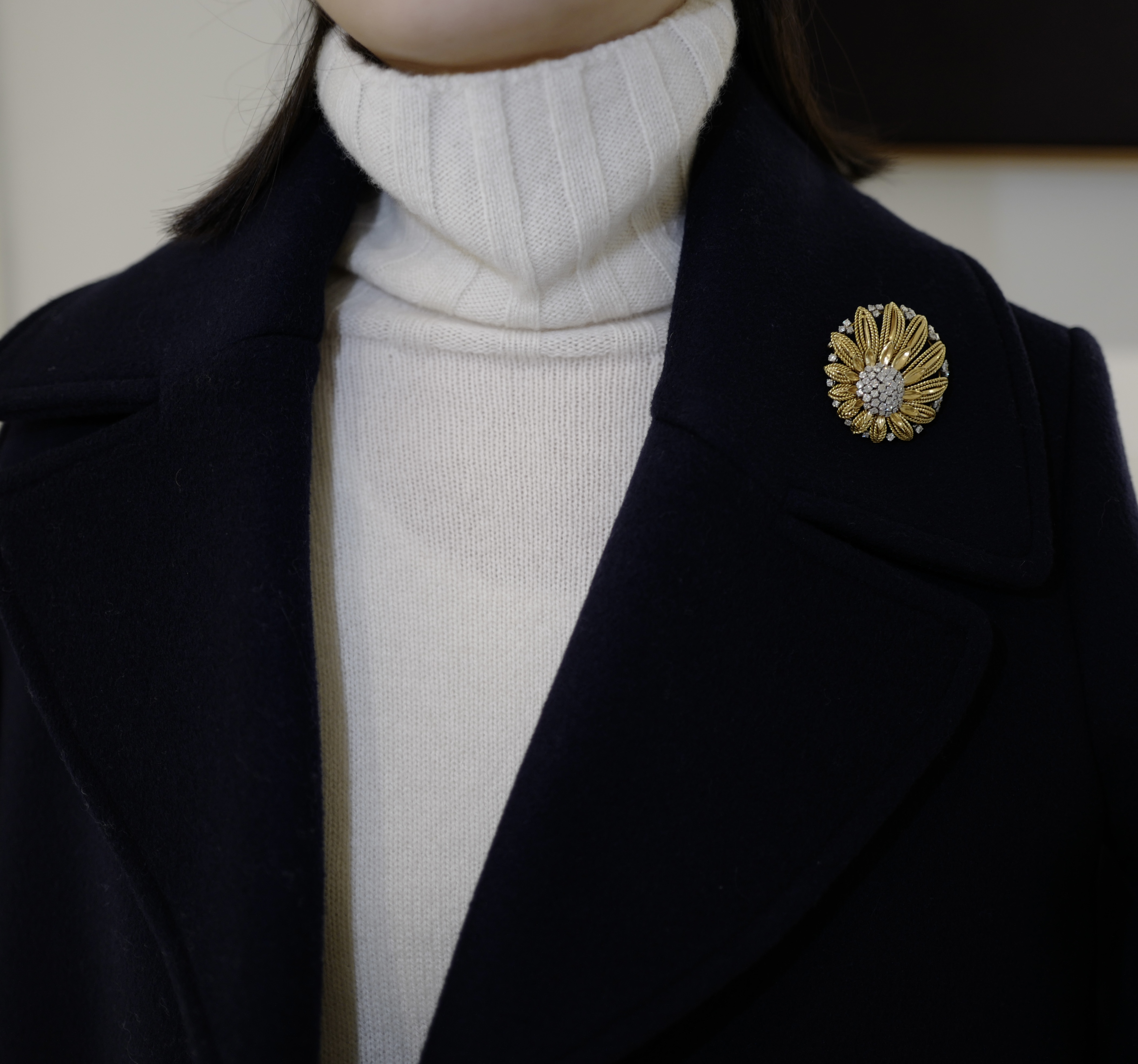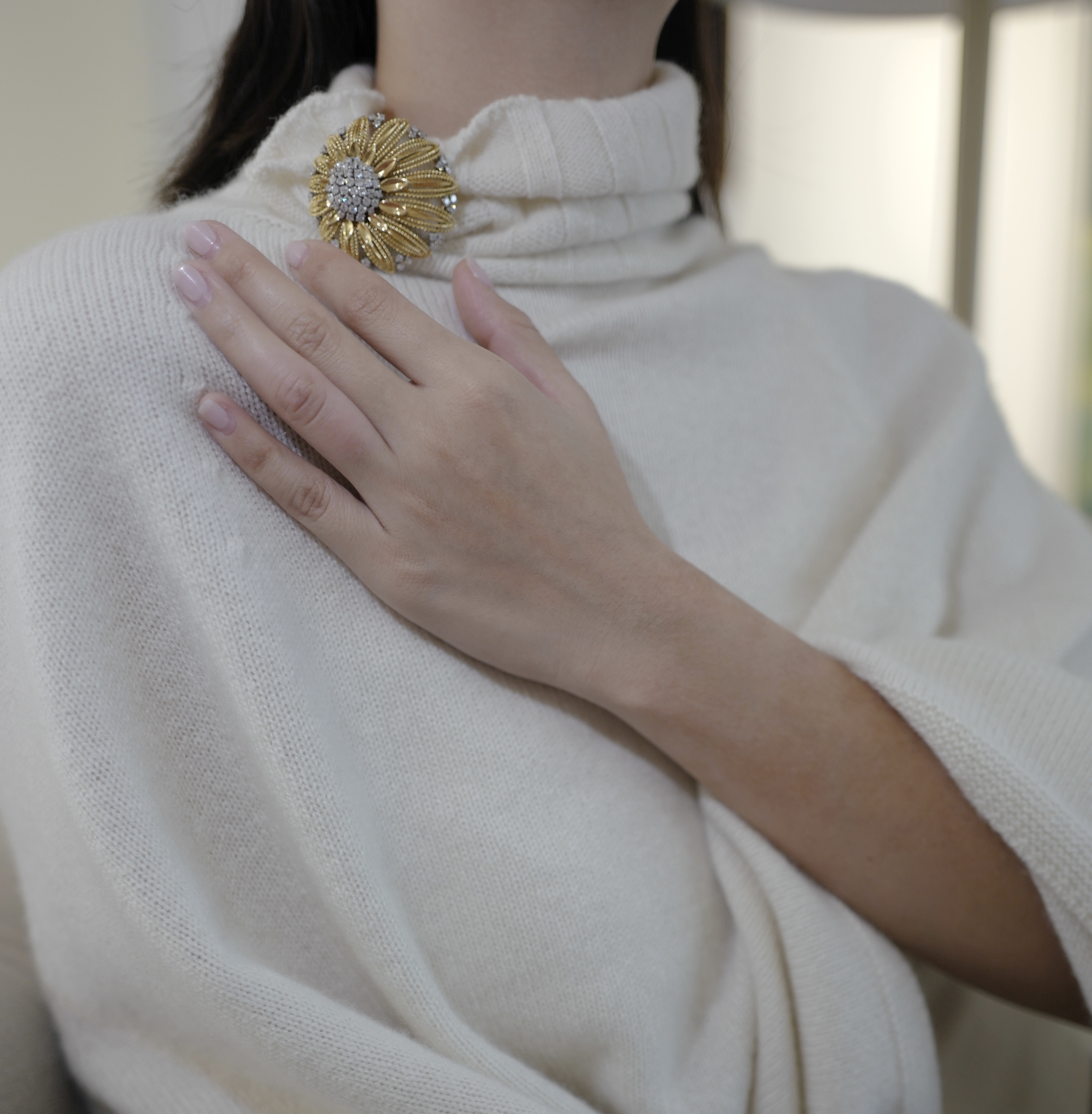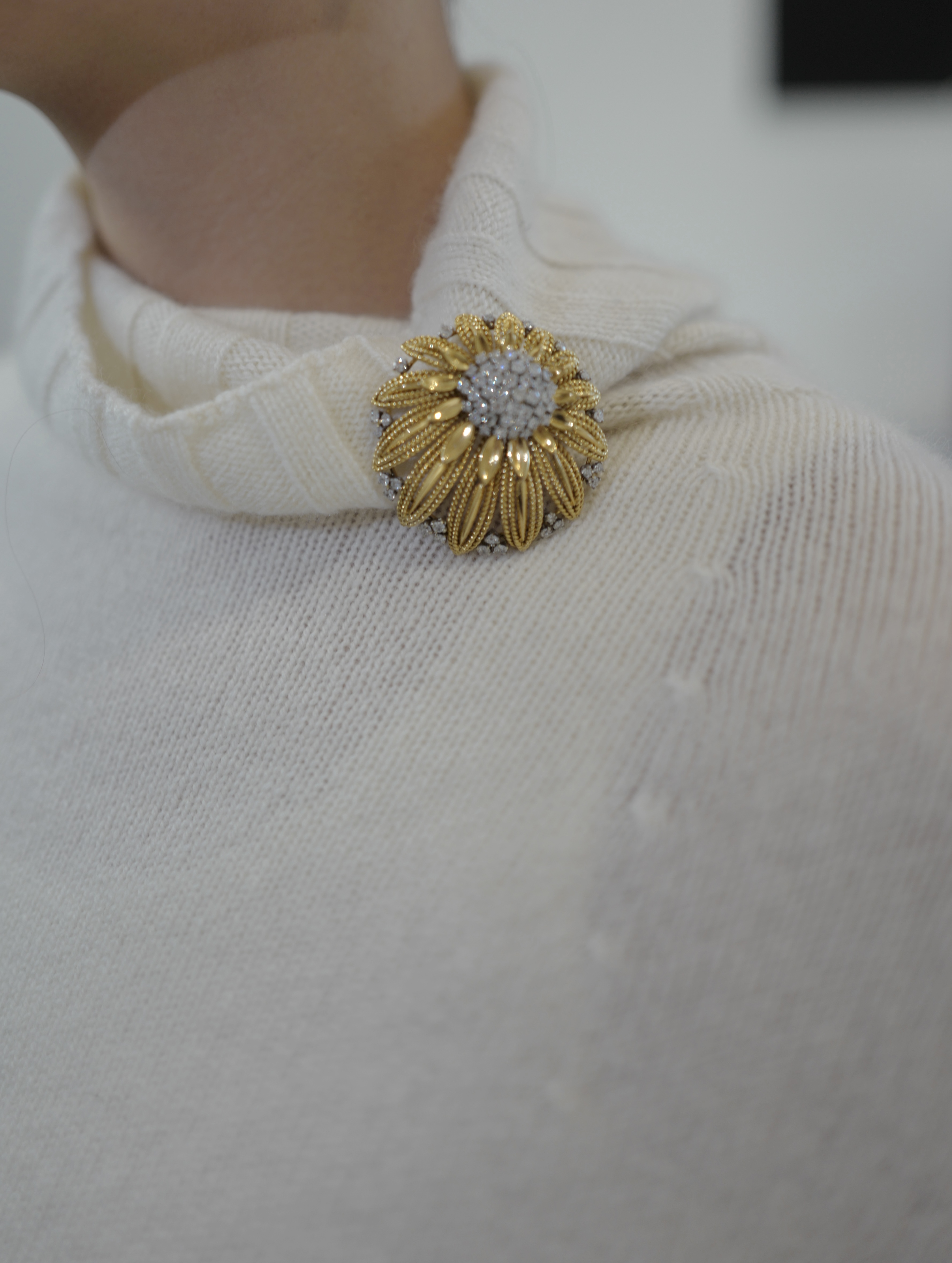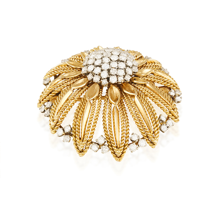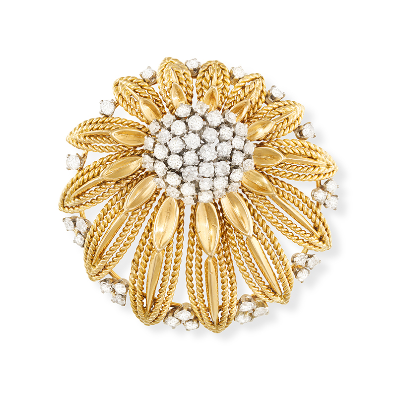 A stylized Flowerhead Gold and Diamond Brooch