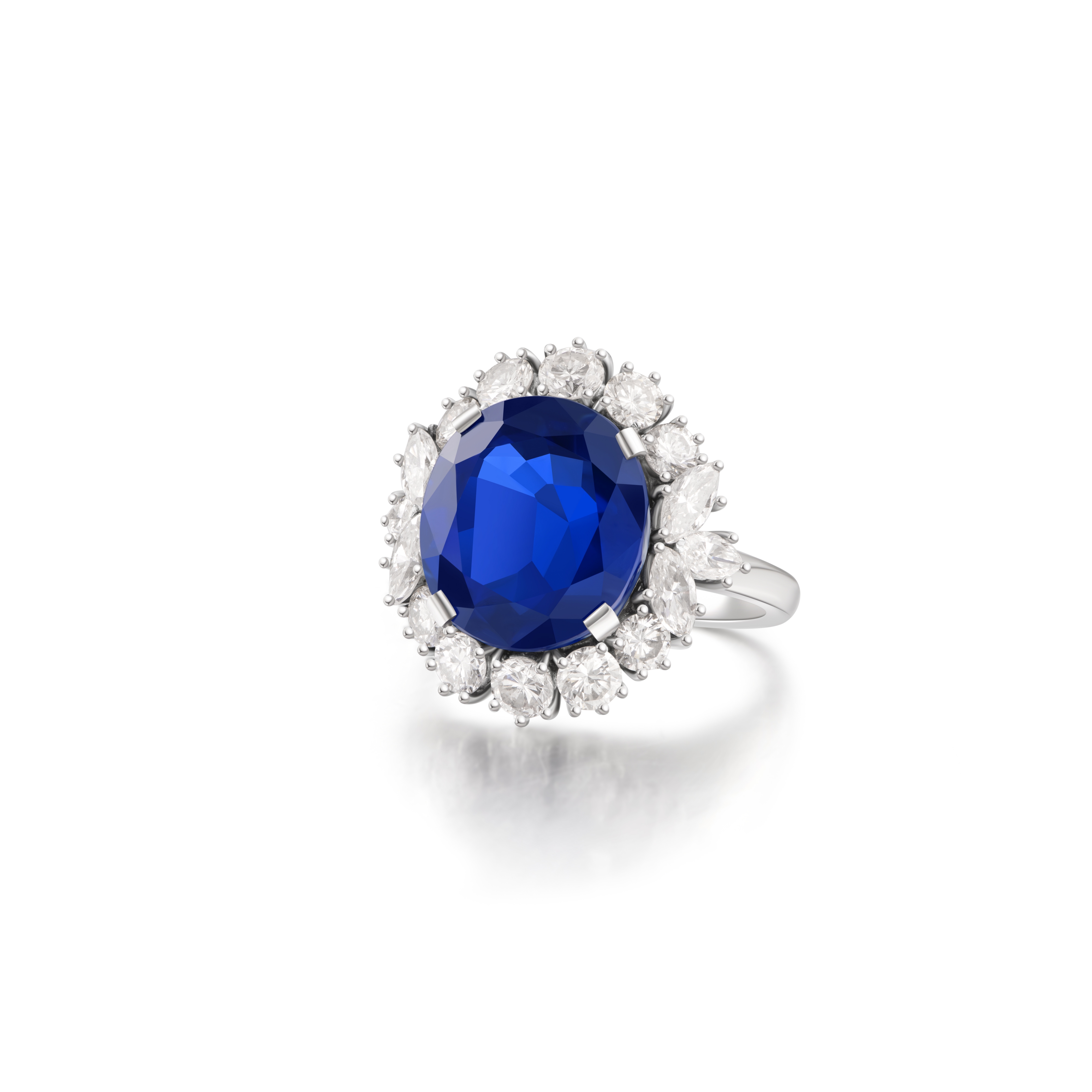 Set with a central antique oval-shape sapphire weighing 8.8ct, within numerous brilliant/step cut diamonds surround, mounted in white gold. Signed Bvlgari.