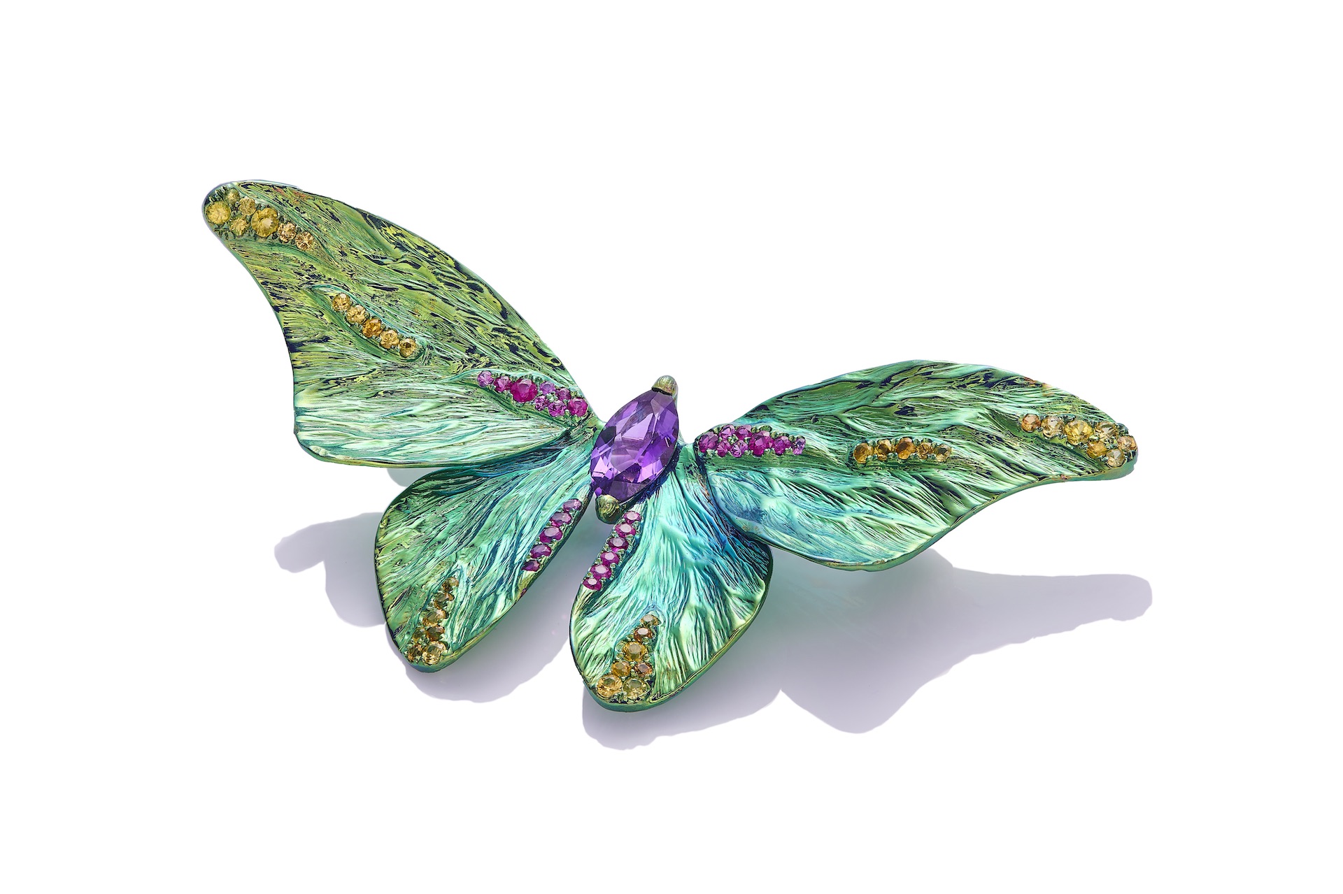 Designed as a butterfly, the body set with a marquise-shaped tsavorite garnet, to the butterfly specimen wings embellished with pink sapphire and yellow sapphire, mounted in titanium.