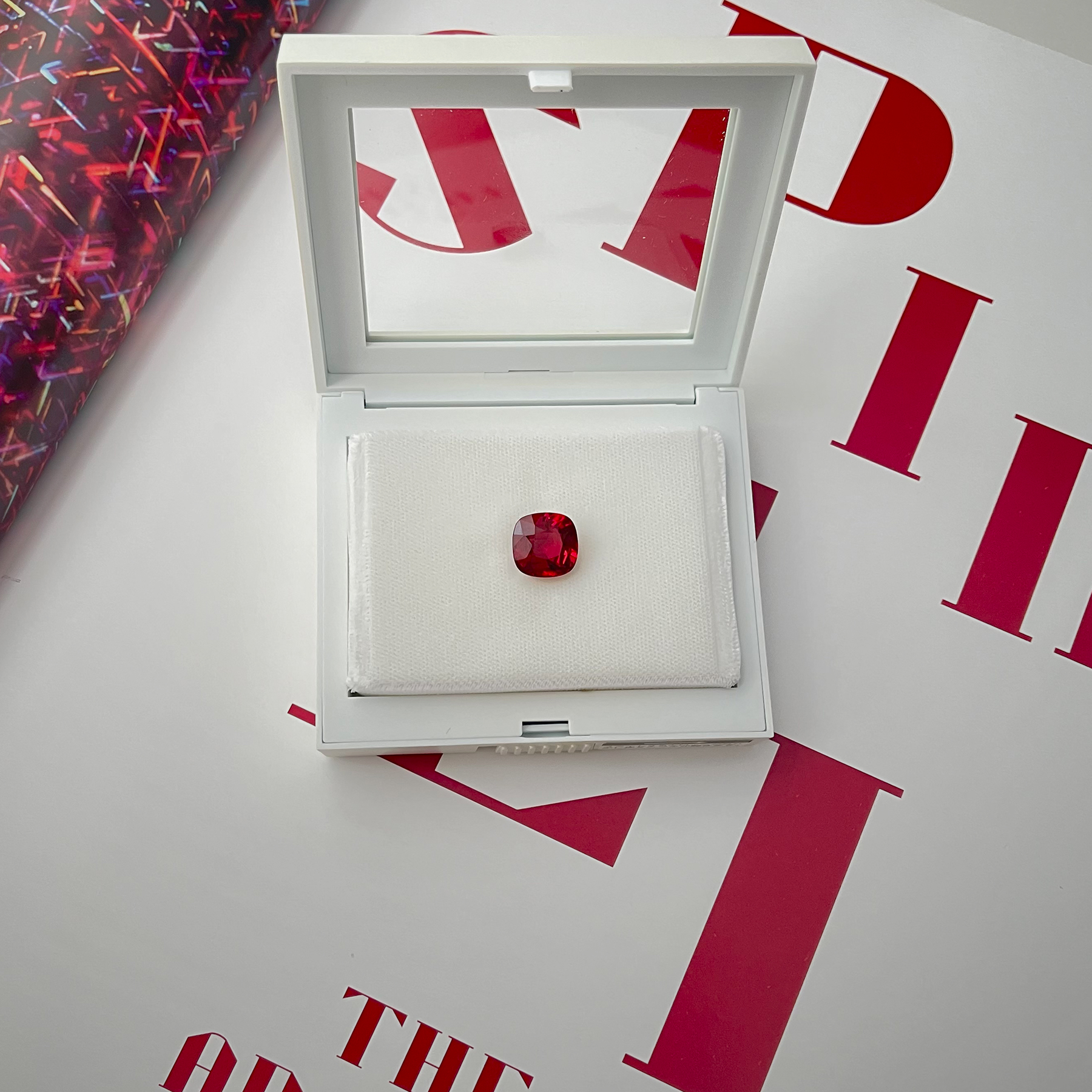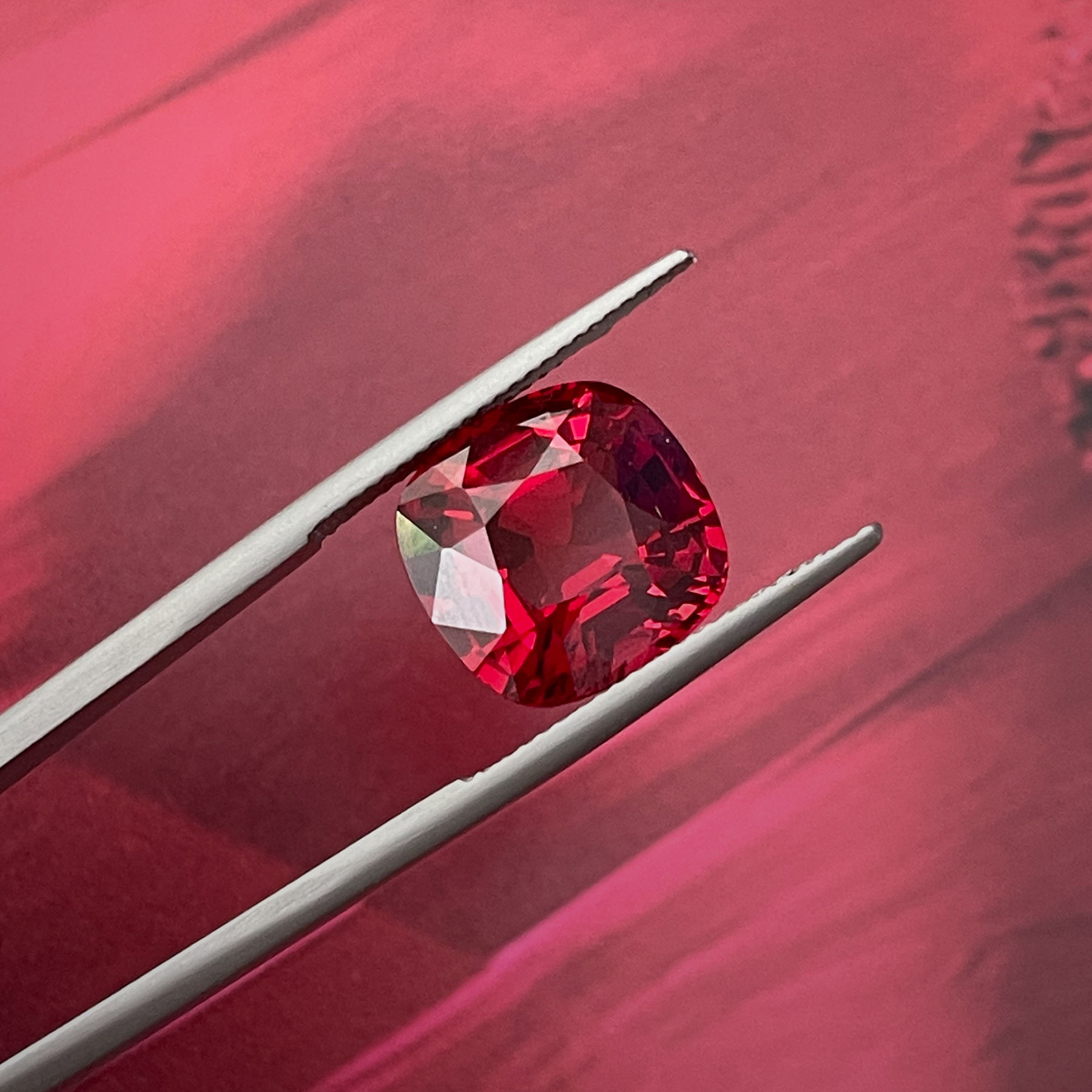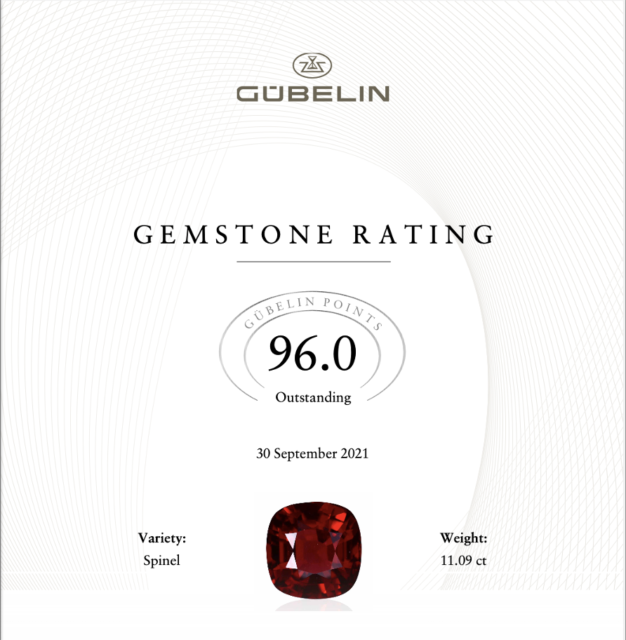 Accompanied by a Gübelin certificate stating that the origin of the spinel is Burma (Myanmar) , also shown that the stone has no indications of heating enhancement. In the appendix, it has stated that stone has a richly saturated and homogeneous color, combined with a high degree of transparency and a finely proportioned cut. Therefore, Gübelin Lab gave the rating of 96.0, outstanding stone.