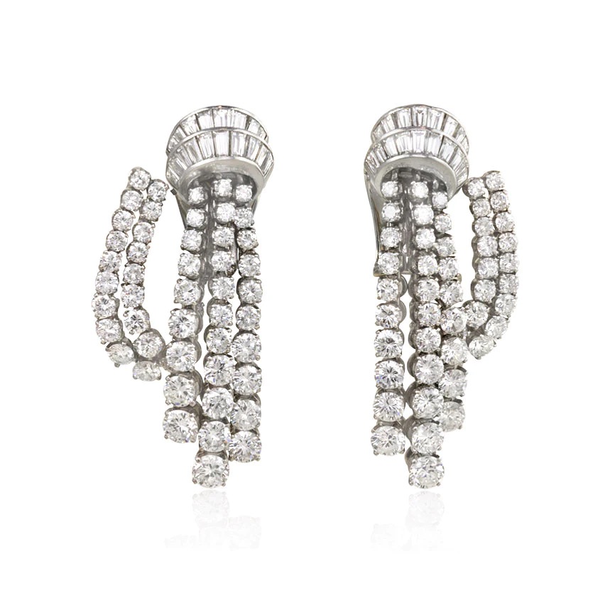 Featuring a cascade of three lines of round-cut diamond set on platinum, held in the upper part of two rounded platinum elements set with baguette-cut diamonds and, laterally, two lines of round-cut diamonds. The clip system is in grey gold.