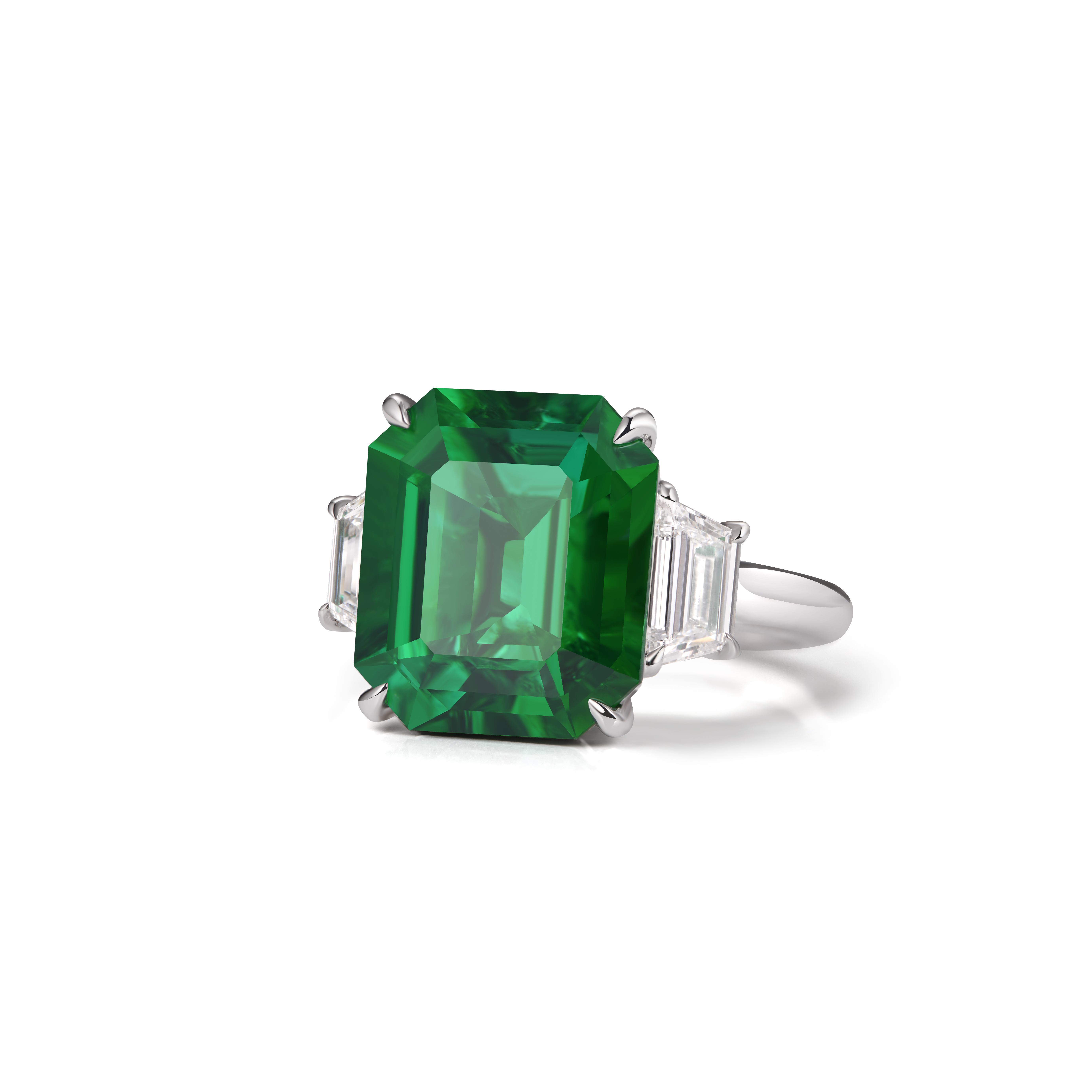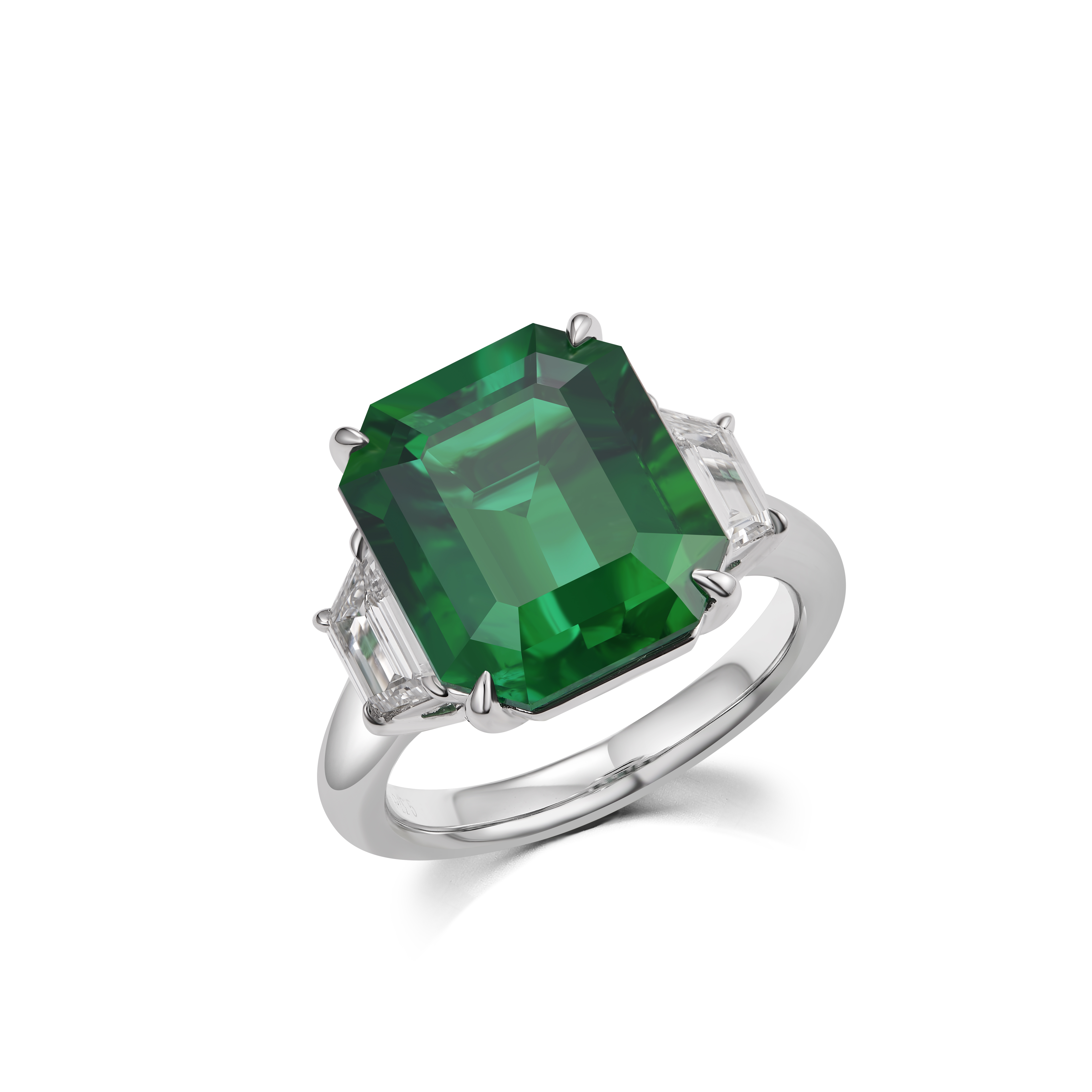 Set with a central octagonal-shape emerald weighing 9.38ct, within two trapezoid step cut diamonds surround, mounted in white gold.