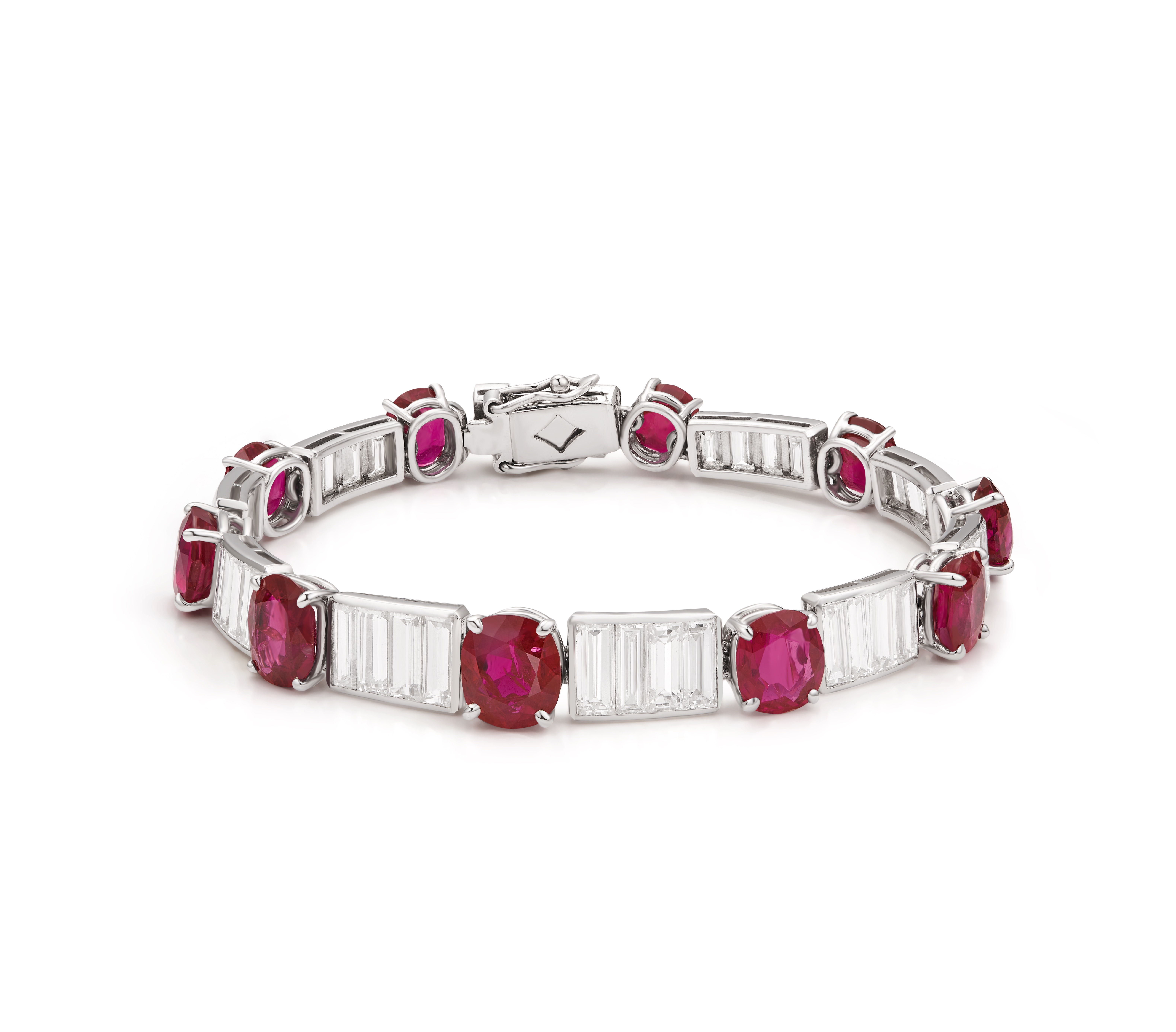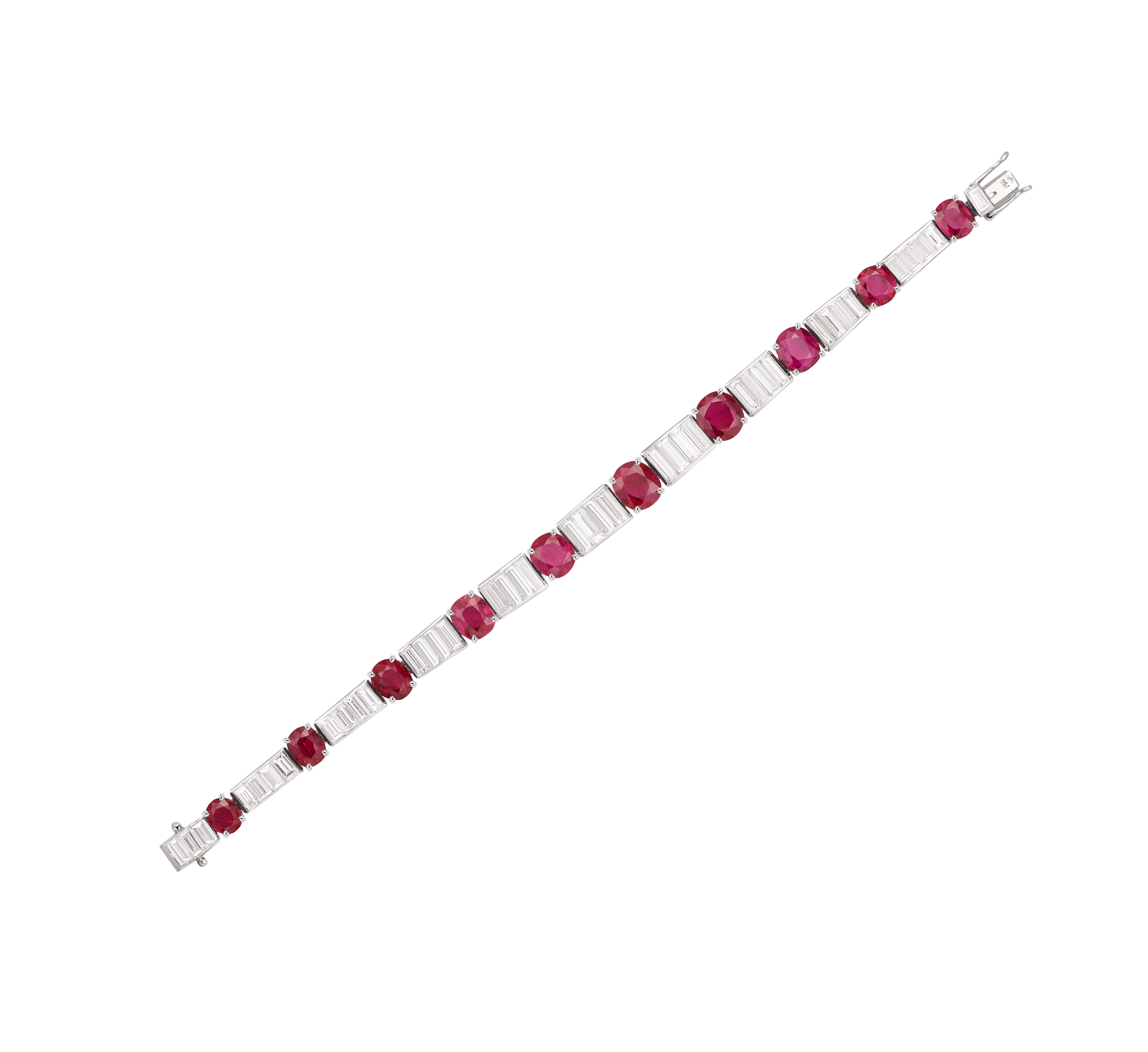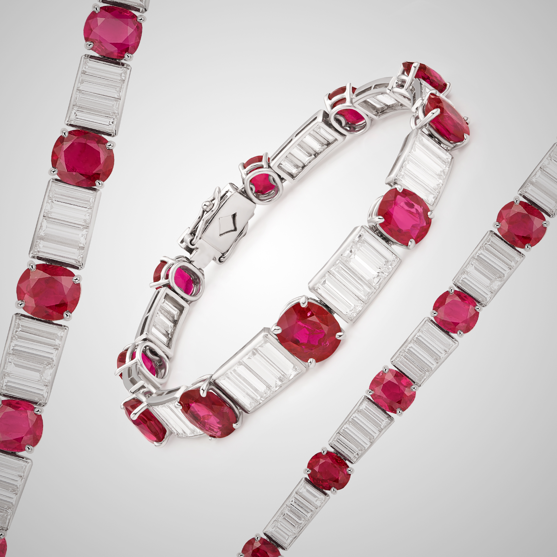 Set with a graduated line of ten oval and antique cushion cut natural rubies, each within a string of baguette-cut diamonds linked, mounted in white gold. Total ruby estimated weight is 18ct. Presented in their light brown case.