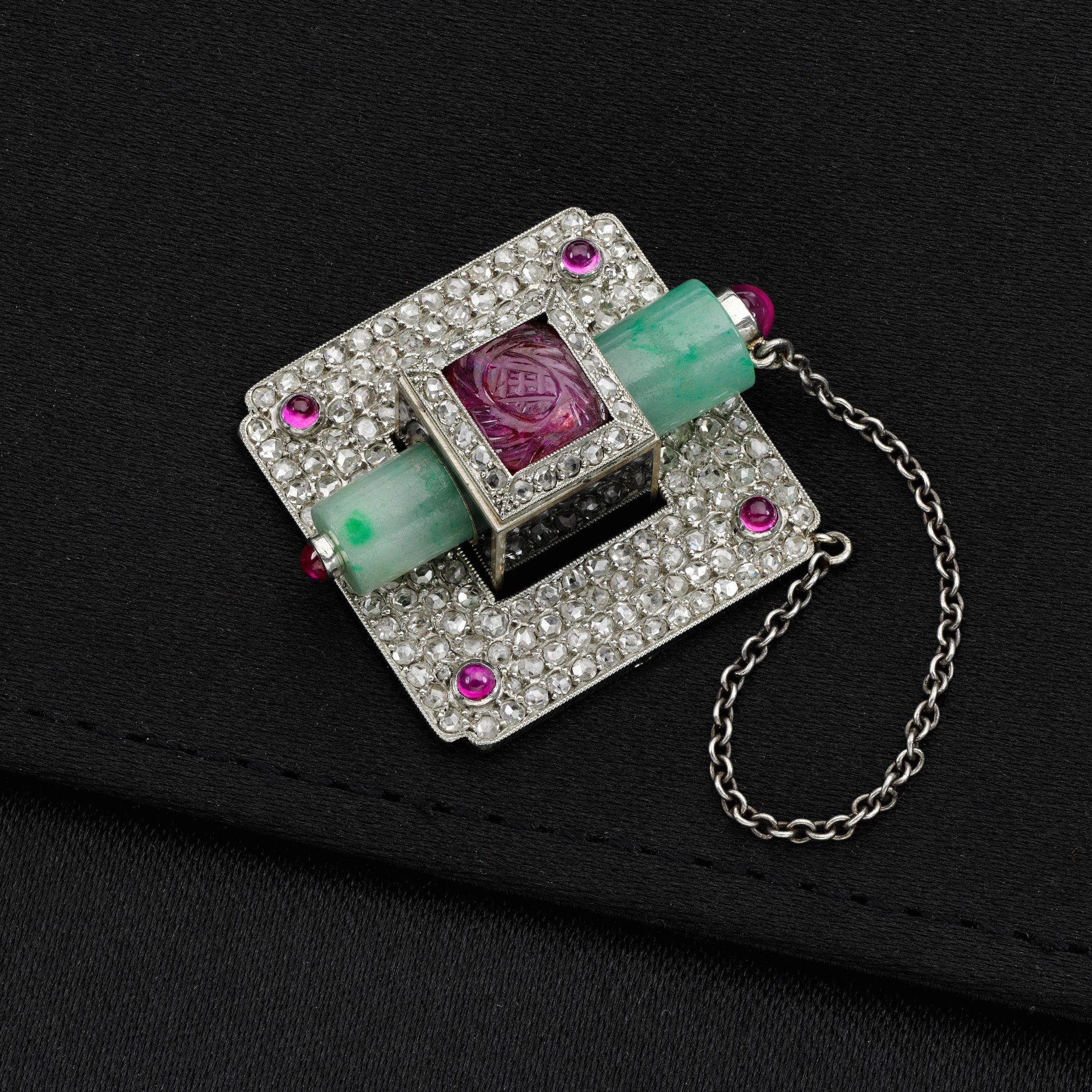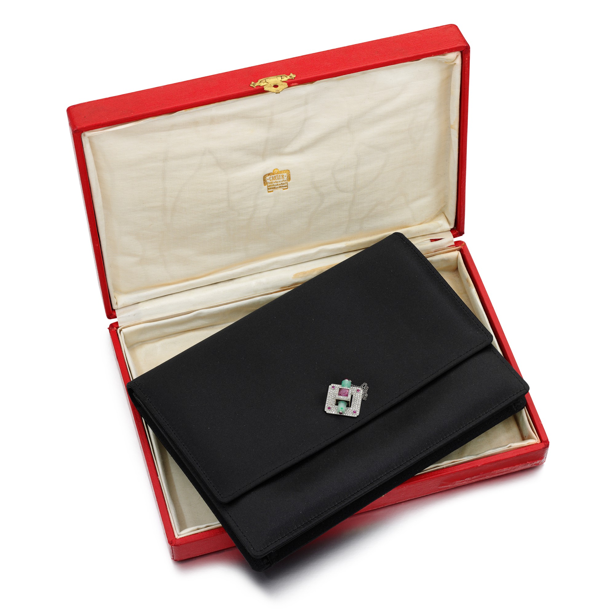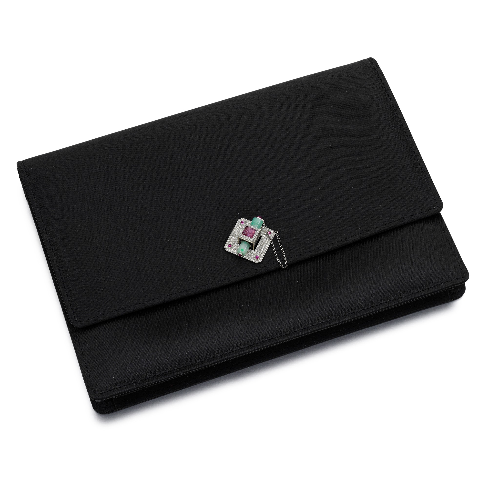 The clasp set with rose-cut diamonds, cabochon and carved rubies, a jadeite baton and applied with black enamel, to a rectangular black silk handbag with two compartments, interior stamped Cartier, clasp with French assay mark and partial maker's mark, case stamped Cartier.