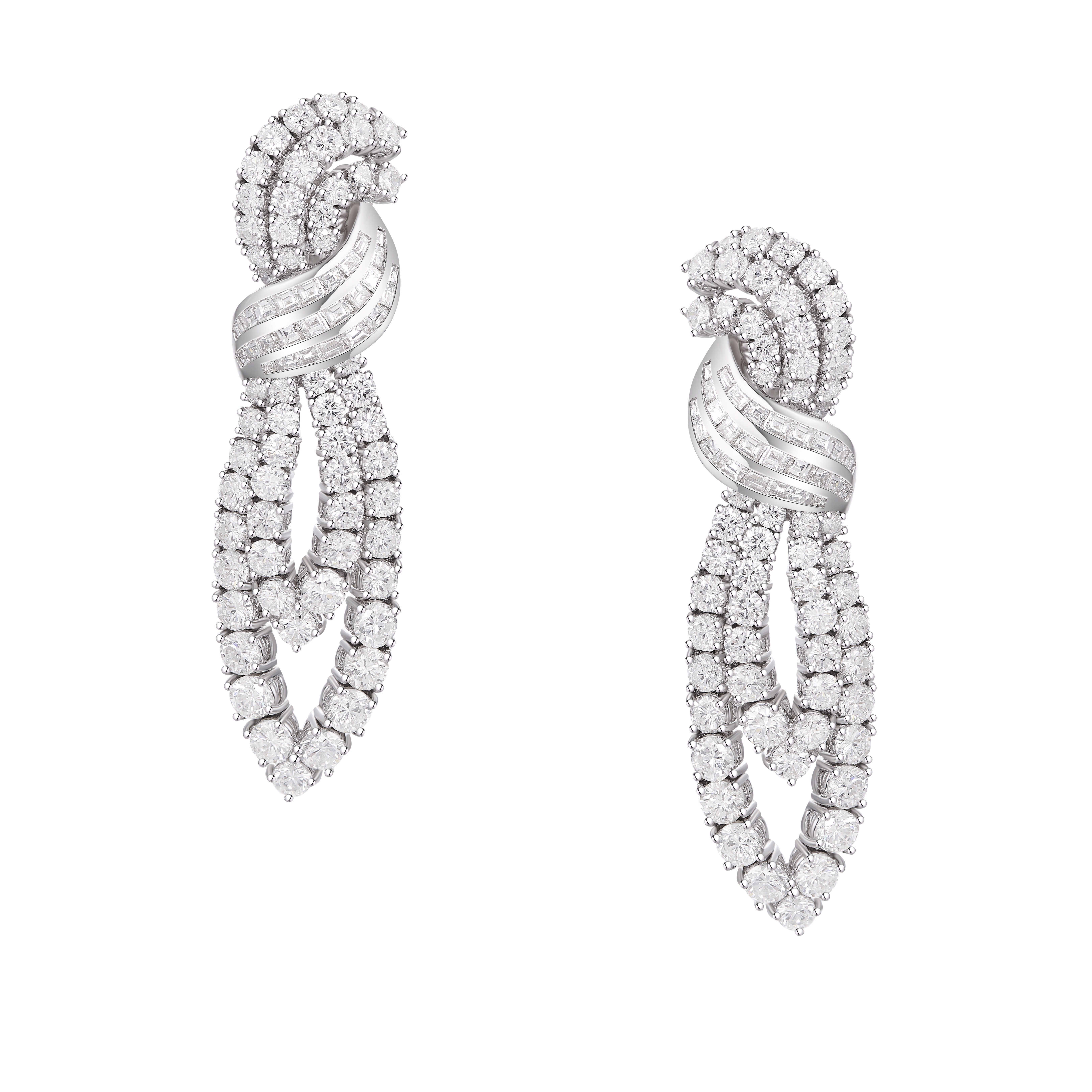 The earrings used monochromatic diamonds and mounted in platinum. The diamonds of different forms created plays of light. Note that this piece can be also wearing as clips.