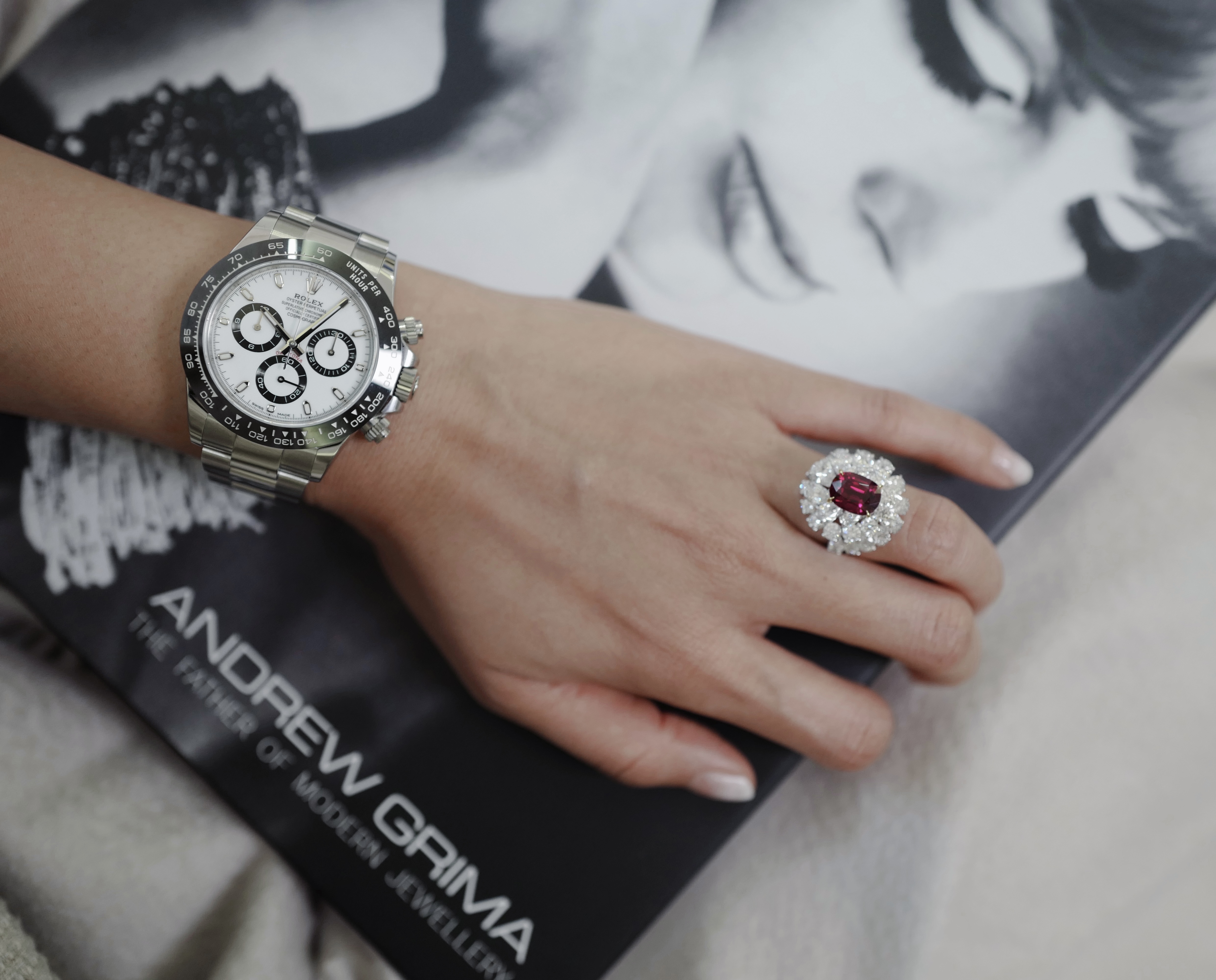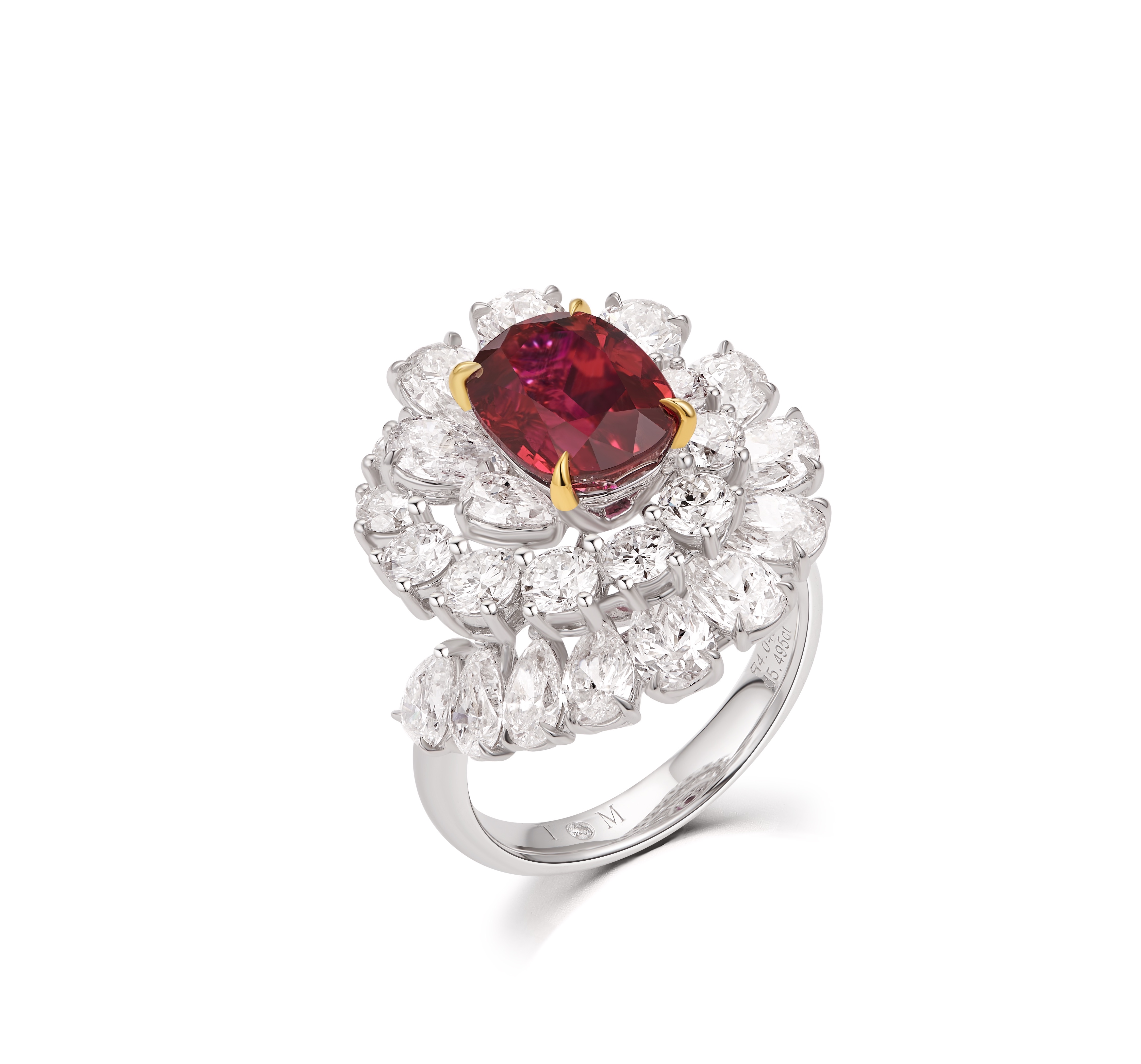 Set with a central cushion-shaped ruby weighing 4.04 carats, surrounded with numerous pear-shaped and round diamonds, mounted in white gold.
